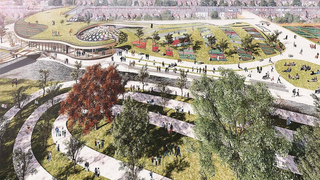 A mesmerising feature of Sparkhill Revive is the River Cole Bandstand, which marries nature, light, and architecture. Its gridshell structure, adorned with mosaic and stained-glass panels, casts radiant light onto a serene, man-made pond, inviting children to engage with the water in a safe, playful environment. This fusion of artistry and nature fosters wonder and curiosity, nurturing connections to the natural world. Sparkhill Revive stands as a testament to the power of thoughtful design in revitalising a community’s spirit and reimagining its future.