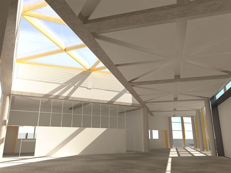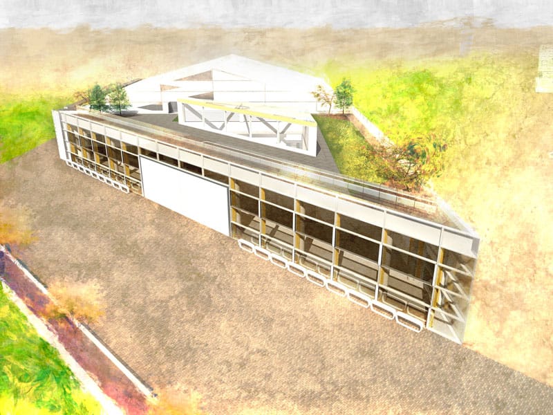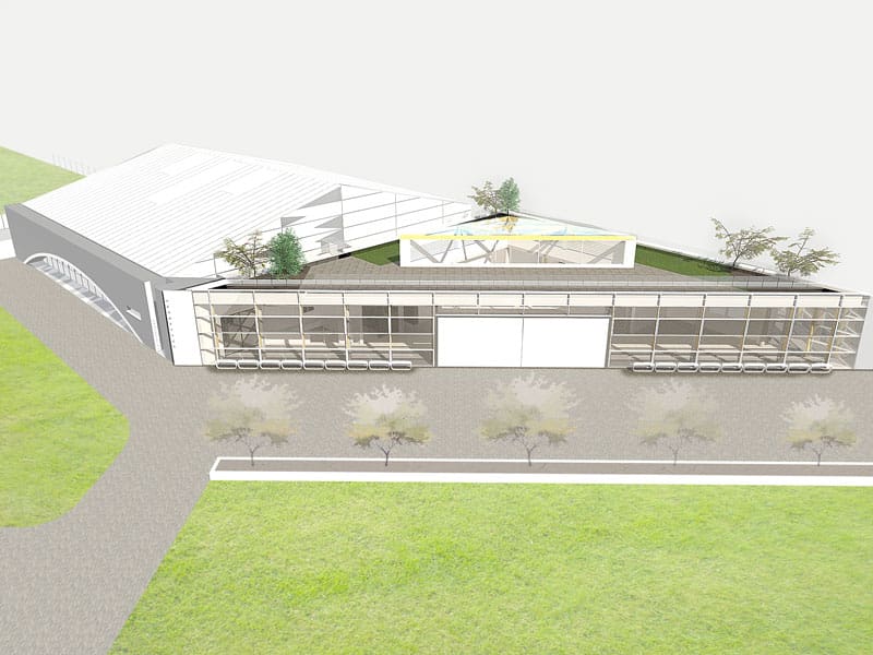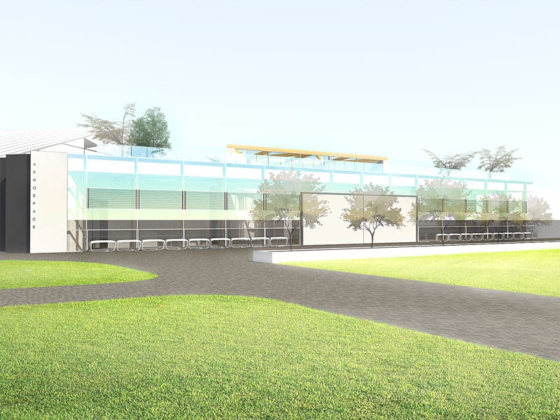 The client had a large plot of land available close to Leicestershire's educational institutions. As part of an initiative to introduce new courses to students and revive crafts no longer widely practiced, Wish Architects proposed an open-plan Workshop Studio which would allow for a mid-sized plane to rear into the space which was designed specifically to accommodate wide aeroplane wing spans for live workshops on aerospace technology.