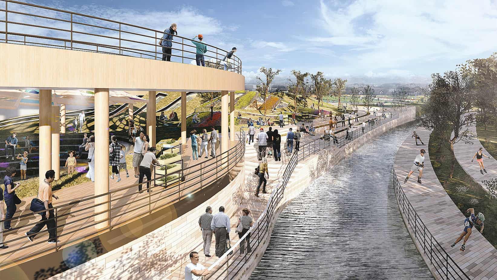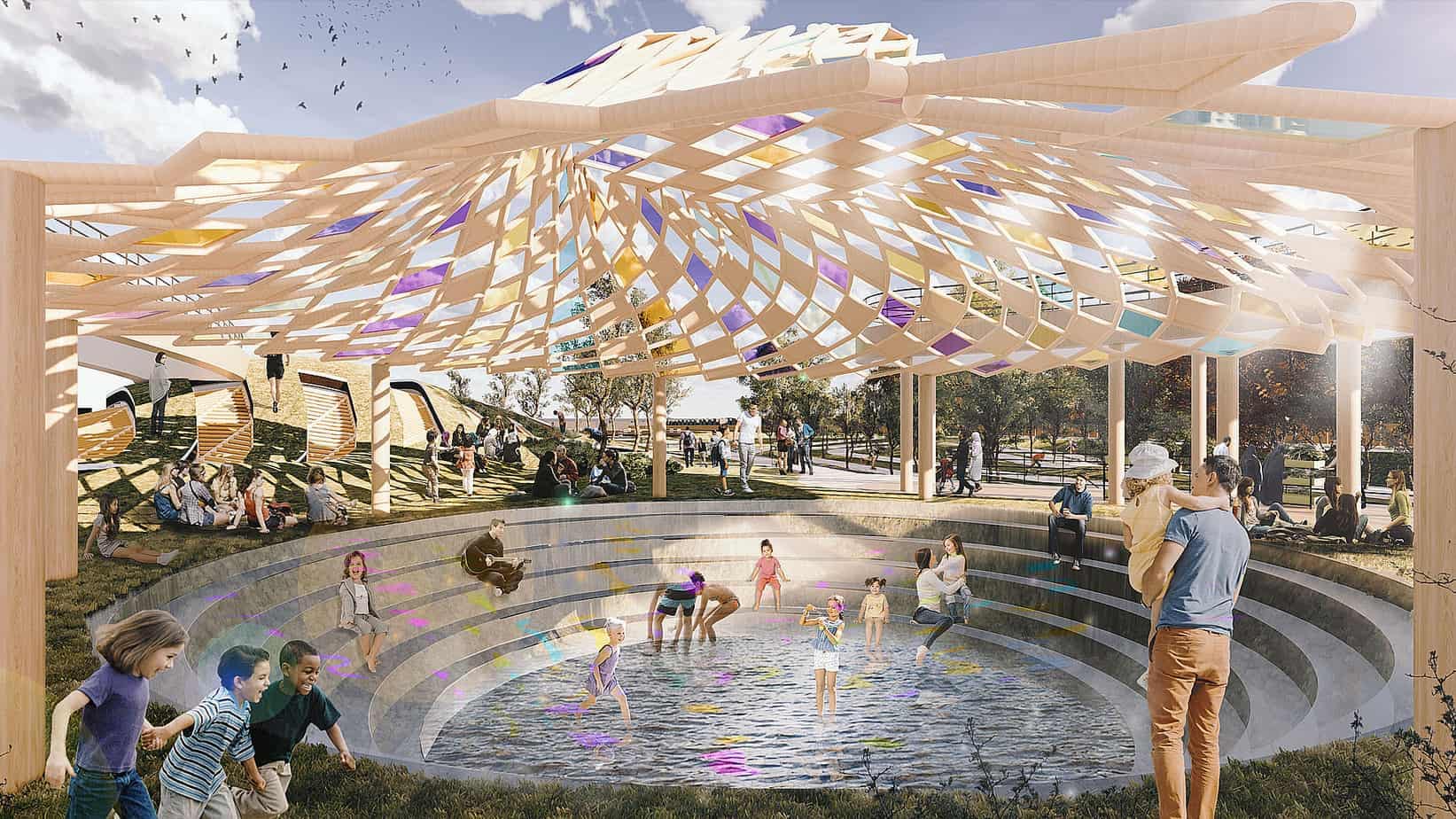 The bandstand's gridshell design, adorned with a stunning array of stained-glass panels, creates a magical, dancing display of light and color. As the sun's rays filter through the intricate panels, radiant fragments of light cascade down to the water's surface, casting mesmerising reflections and patterns. The dazzling interplay of light and water immerses children in a kaleidoscope of color as they splash and play together in the shimmering, filtered water.